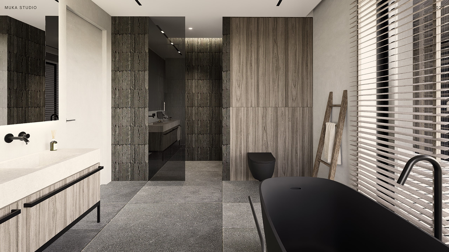 The heart of the house is the spacious living area with a living room and a separate kitchen area with a dining room. The longer walls of the house are mostly glass, so we can freely observe the surrounding landscape. There is a fireplace in the gable wall of the living room, which was finished in dark brick. This is the central relaxation area of the house. The second part of the house is the owners' separate private zone, which includes a bedroom with a dressing room and a bathing room. The living area is separated from the private area by a spacious glass hall with stairs to the first floor where the guest rooms are located.
