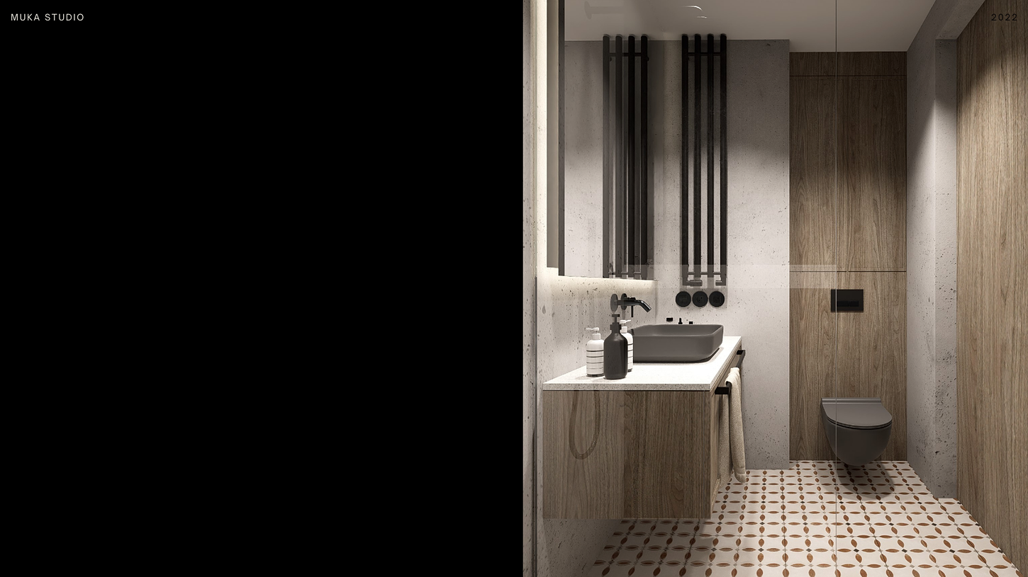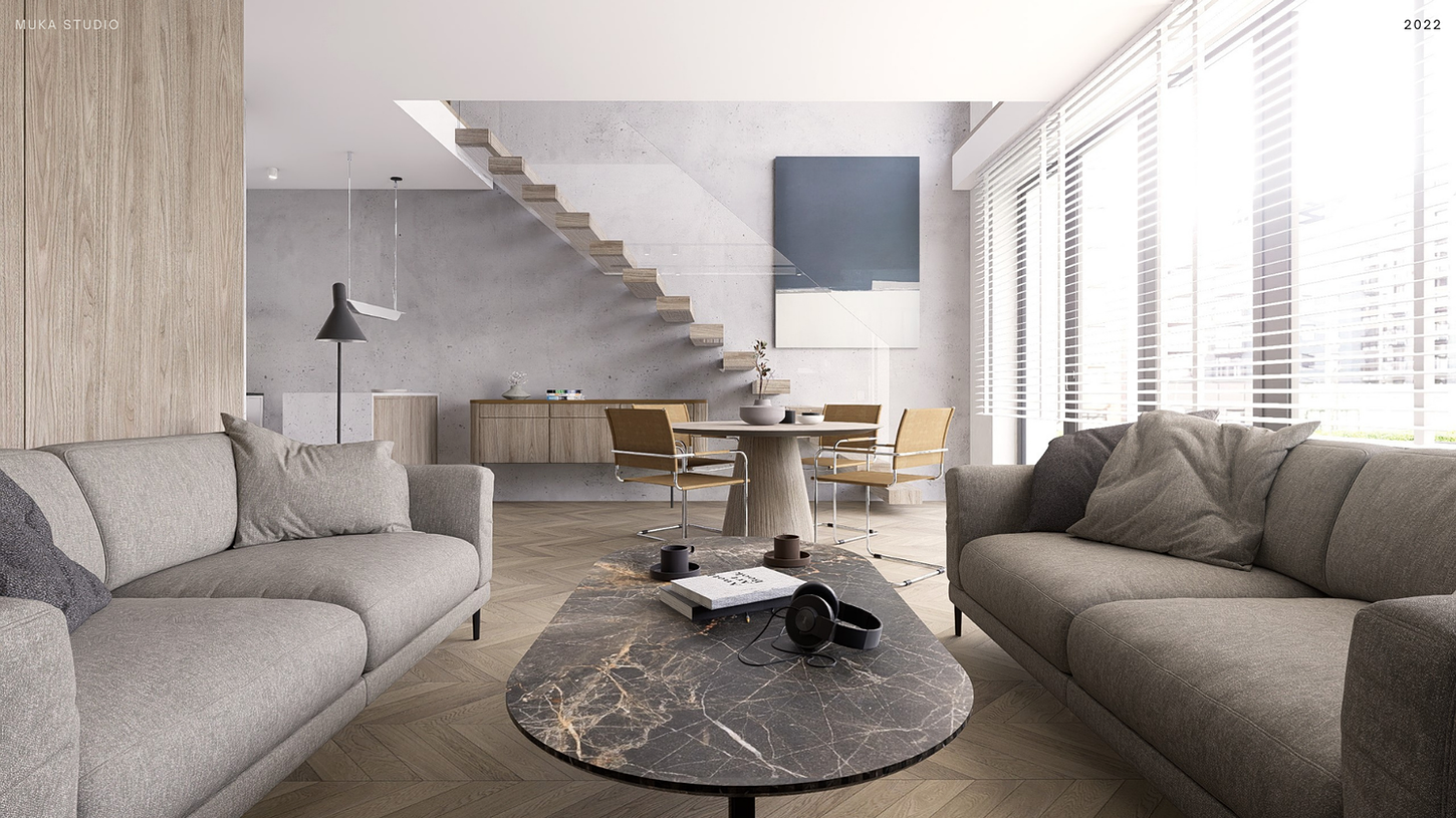 The project uses a sparing palette of natural colors of natural walnut veneer combined with the effect of raw concrete, complementing this combination there are black equipment elements such as: a loft metal shelf in the living room, a loft glass wall on the first floor in the bedroom, black track rails with reflectors, door handles, socket and switch frames, washbasin taps and other accessories.