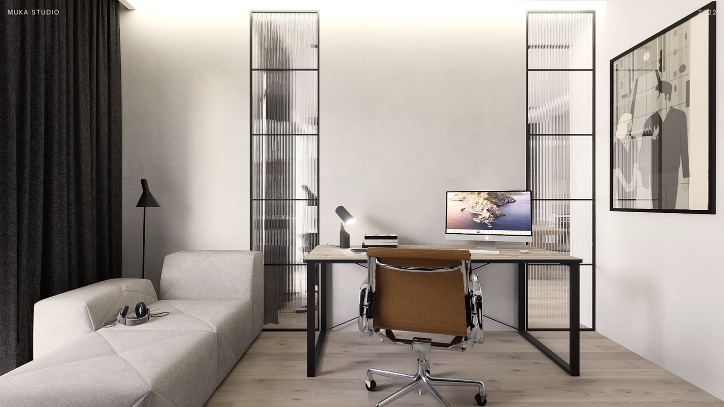 The apartment consists of a spacious living room with a kitchenette, a study, a bedroom and a bathroom. The dominant color palette is natural walnut veneer, white and graphite with warm shades of upholstery and curtains. Glass walls made of grooved glass were used between the office and the living room. The bathroom is finished with tiles with the effect of a large natural stone pattern.