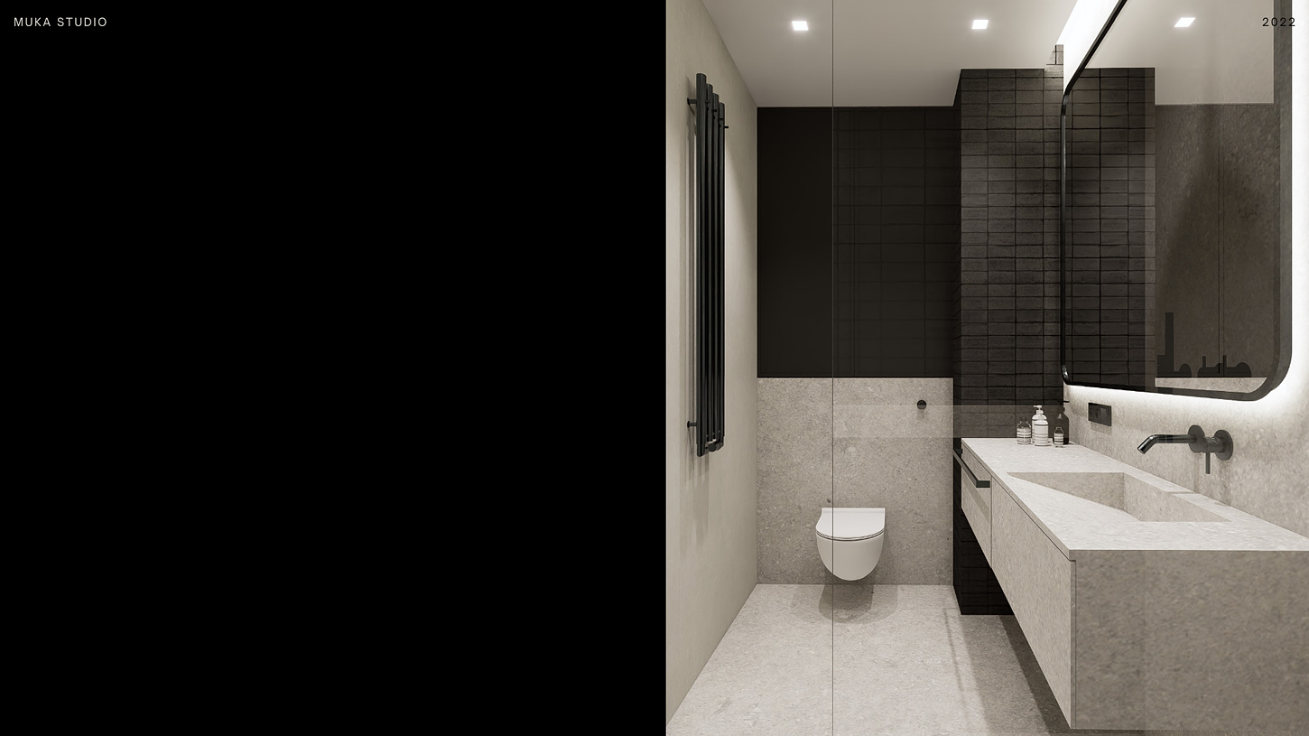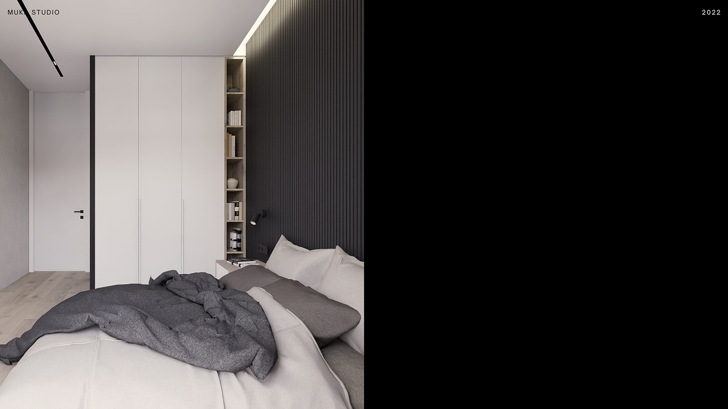 Mieszkanie składa się z przestronnego salonu z aneksem kuchennym, gabinetu, sypialni oraz łazienki. Dominującą paletą barw jest naturalny fornir orzechowy, biel oraz grafit wraz ciepłym odcieniem tapicerek i zasłon. Między gabinetem a salonem zastosowano ścianki szklane wykonane ze szkła ryflowanego. Łazienka wykończona jest w płytkach z efektem dużego rysunku naturalnego kamienia.