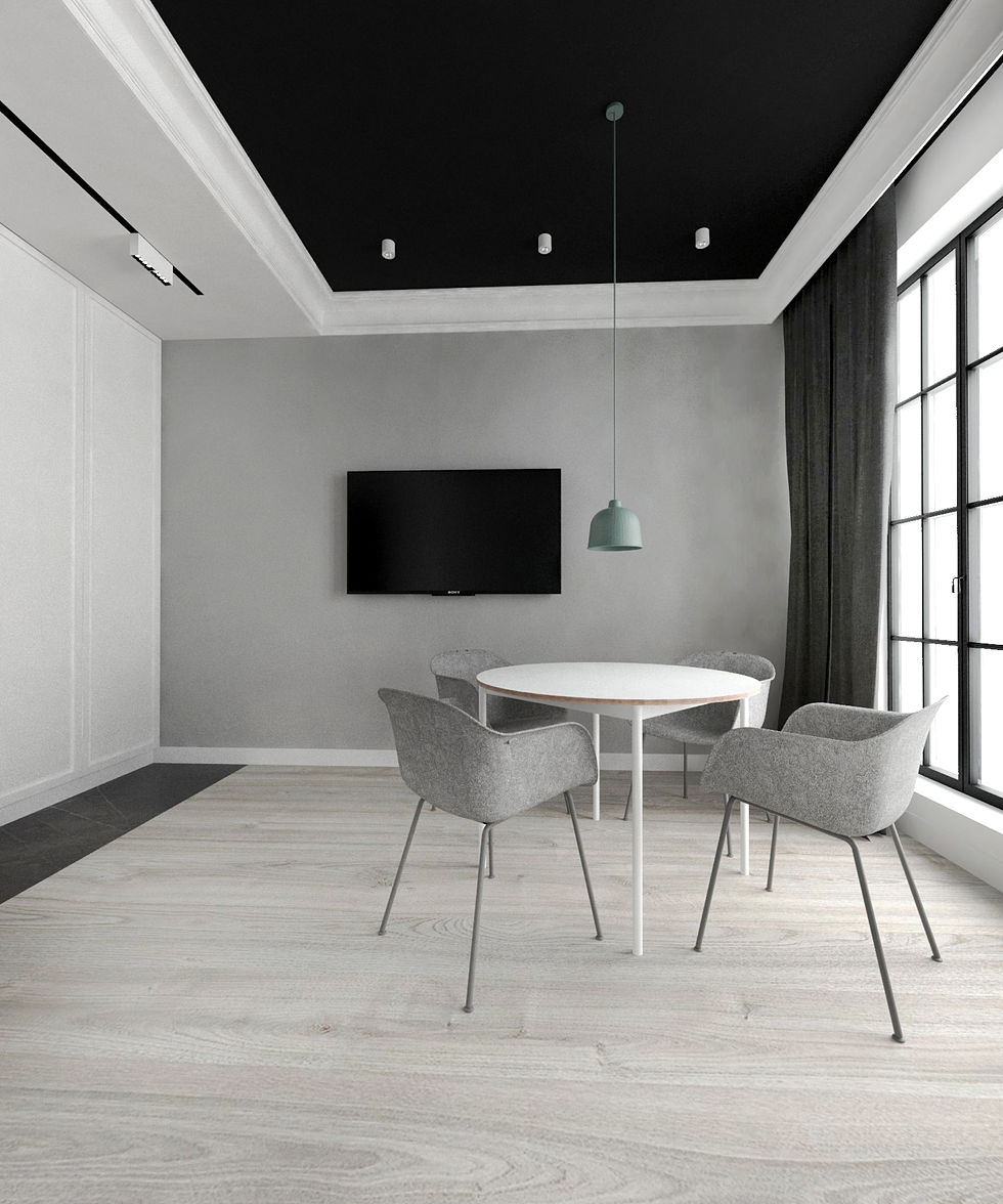 The apartment is decorated in subdued shades of white, gray and graphite with a characteristic black ceiling accent finished with an elegant ceiling cornice. An additional touch breaking this tone are