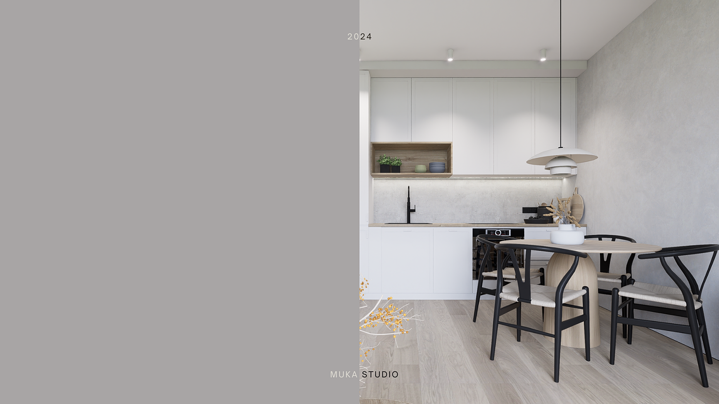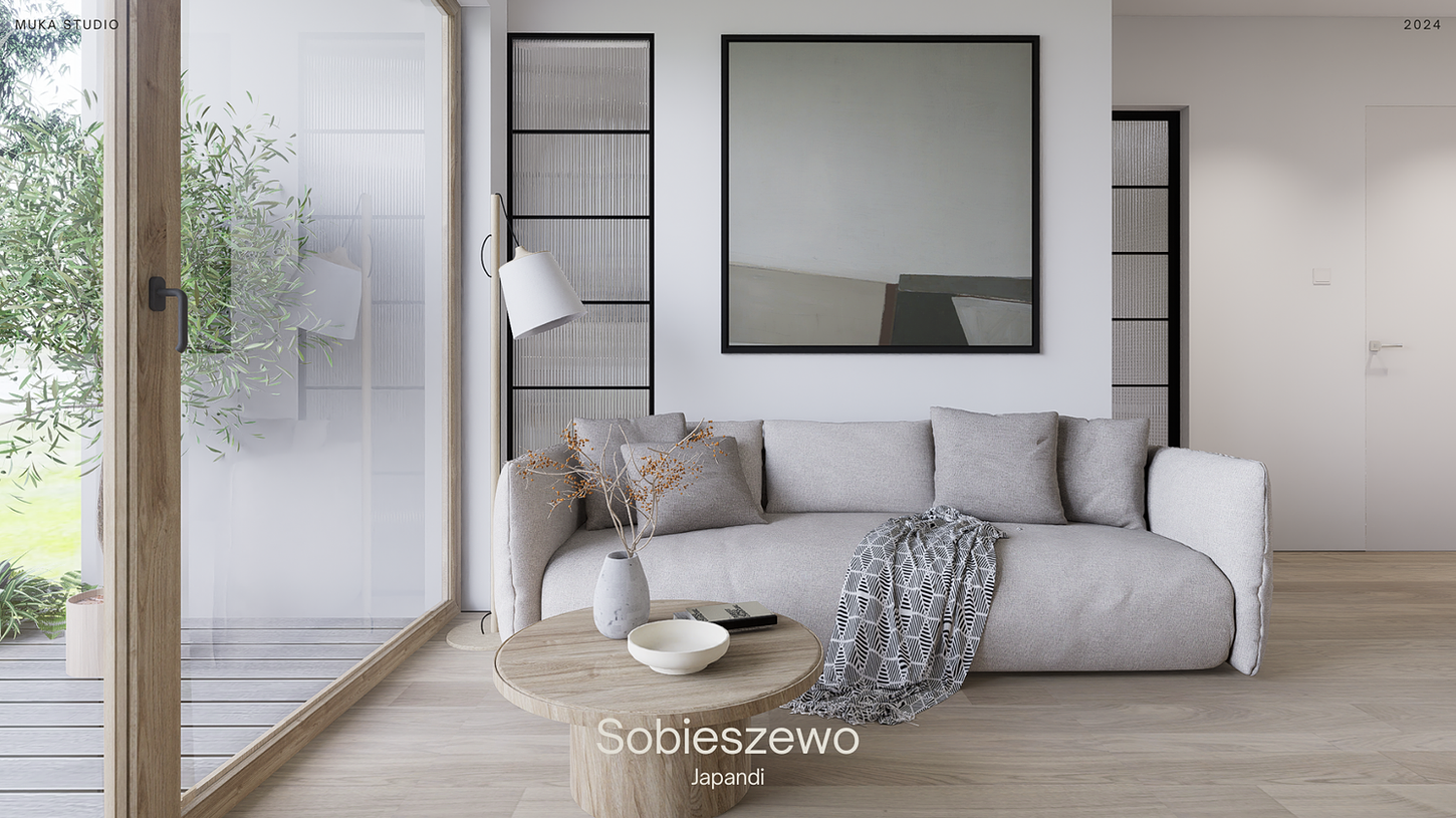 Design of a three-room holiday apartment in Gdańsk Sobieszewo. The apartment is decorated in the Japandi style, characterized by the use of natural materials in light tones: wooden floors in a shade of light natural oak, off-white walls, and decorative plaster in shades of gray, with dark graphite elements for contrast.