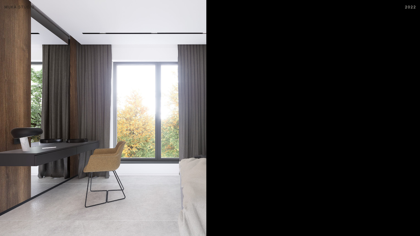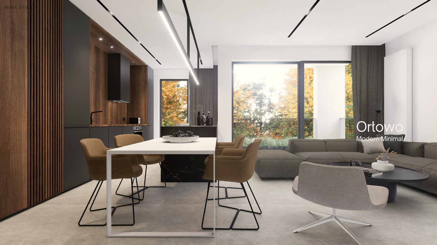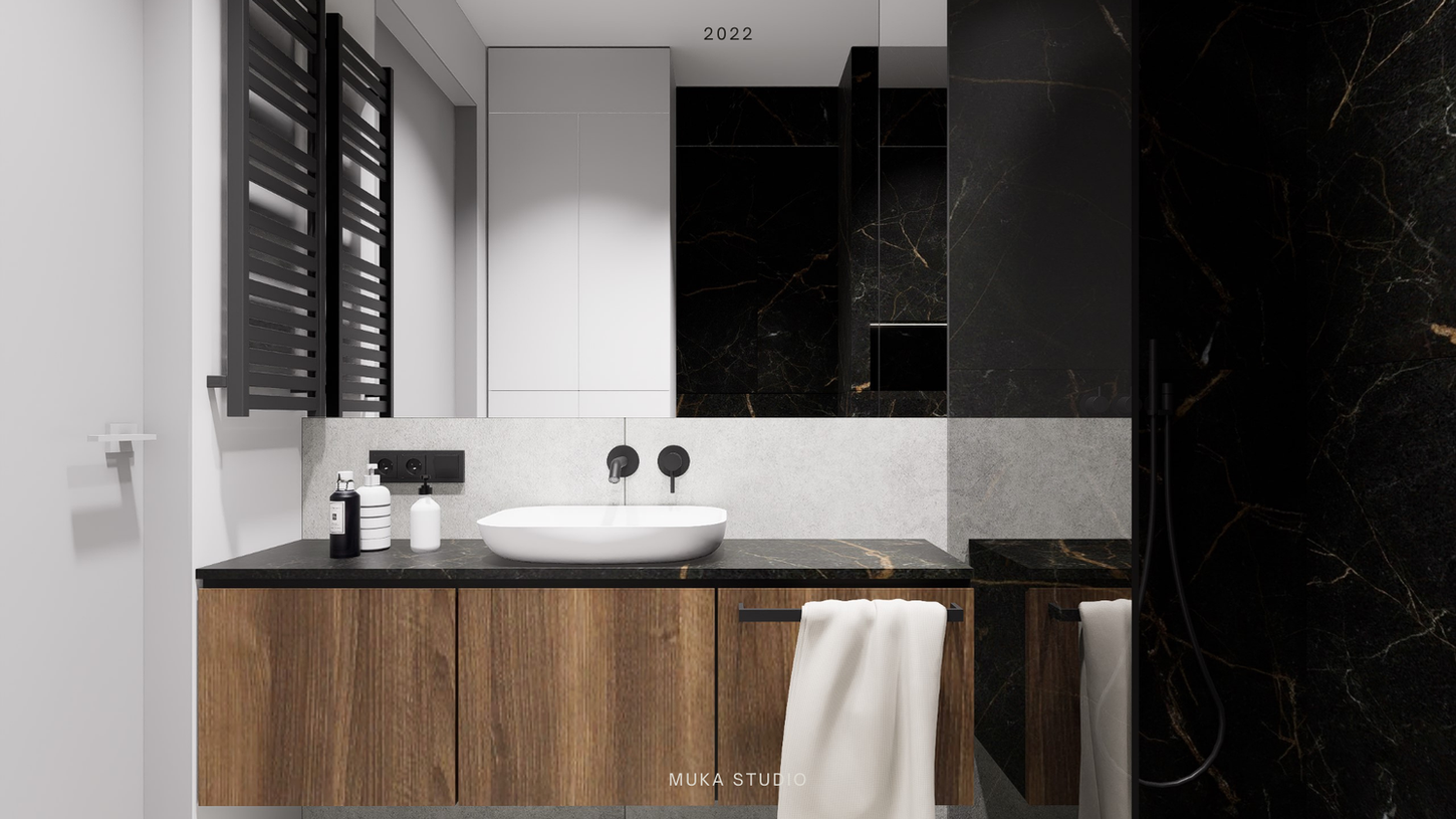 Gdyni Orłowo. Aranżacja przestrzeni mieszkania obejmuje przestronny salon wraz aneksem kuchennym, sypialnię gospodarzy oraz łazienkę. Kolorystyka mieszkania utrzymana jest w odcieniach bieli, szarości, zgaszonych brązów oraz użytym dla skontrastowania fornirem orzechowym. Wyposażenie meblowe jest proste ale eleganckie, mające podkreślać kontemplacyjny charakter mieszkania.