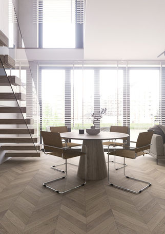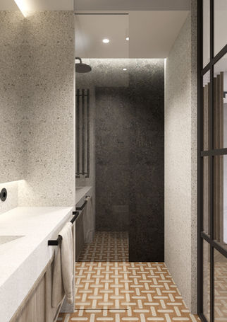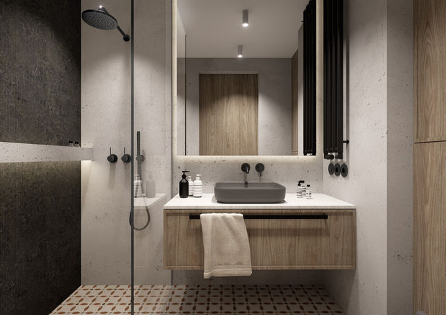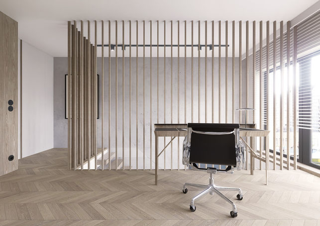 W projekcie zastosowałem oszczędną paletę naturalnych barw naturalnego forniru orzechowego w połączeniu z efektem surowego betonu. Uzupełnieniem tego zestawienia są czarne elementy wyposażenia takie jak: loftowy metalowy regał w salonie, loftowa ścianka na piętrze w sypialni, czarne szynoprzewody z reflektorami, klamki, ramki gniazdek i przełączników, baterie umywalkowe oraz inne dodatki. Całość projektu utrzymana jest w stylistyce nawiązującej do loftu ale w formie bardziej "wygładzonej", gdzie elementy charakterystyczne dla tego stylu nie dominują we wnętrzu.