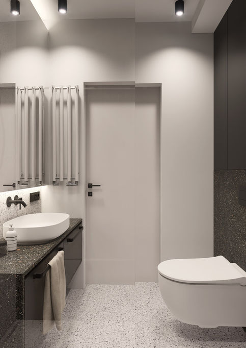Paleta barw zastosowana w projekcie to naturalny fornir dębowy, delikatne odcienie szarości szlachetnego tynku oraz motyw lastryka zastosowanego na podłodze w holu i łazience.