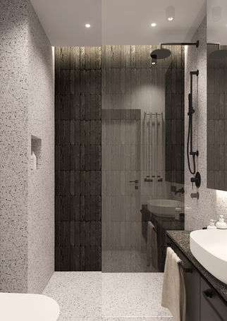 Dla kontrastu w kuchni oraz łazience zastosowano również motyw ciemnej cegły.