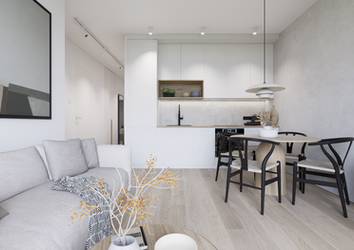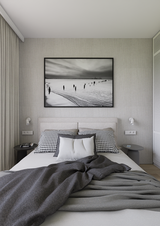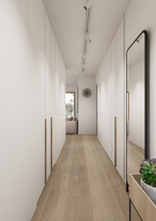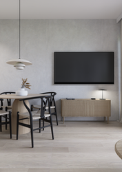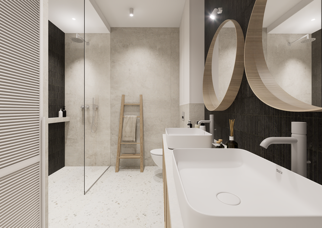 w stylu Japandi, który charakteryzuje się użyciem naturalnych materiałów w tonacji jasnej: podłogi drewniane w odcieniu naturalnego dębu, ściany w kolorze złamanej bieli oraz dekoracyjnego tynku w odcieniach szarości, dla kontrastu wprowadzono elementy w kolorze ciemnego grafitu.